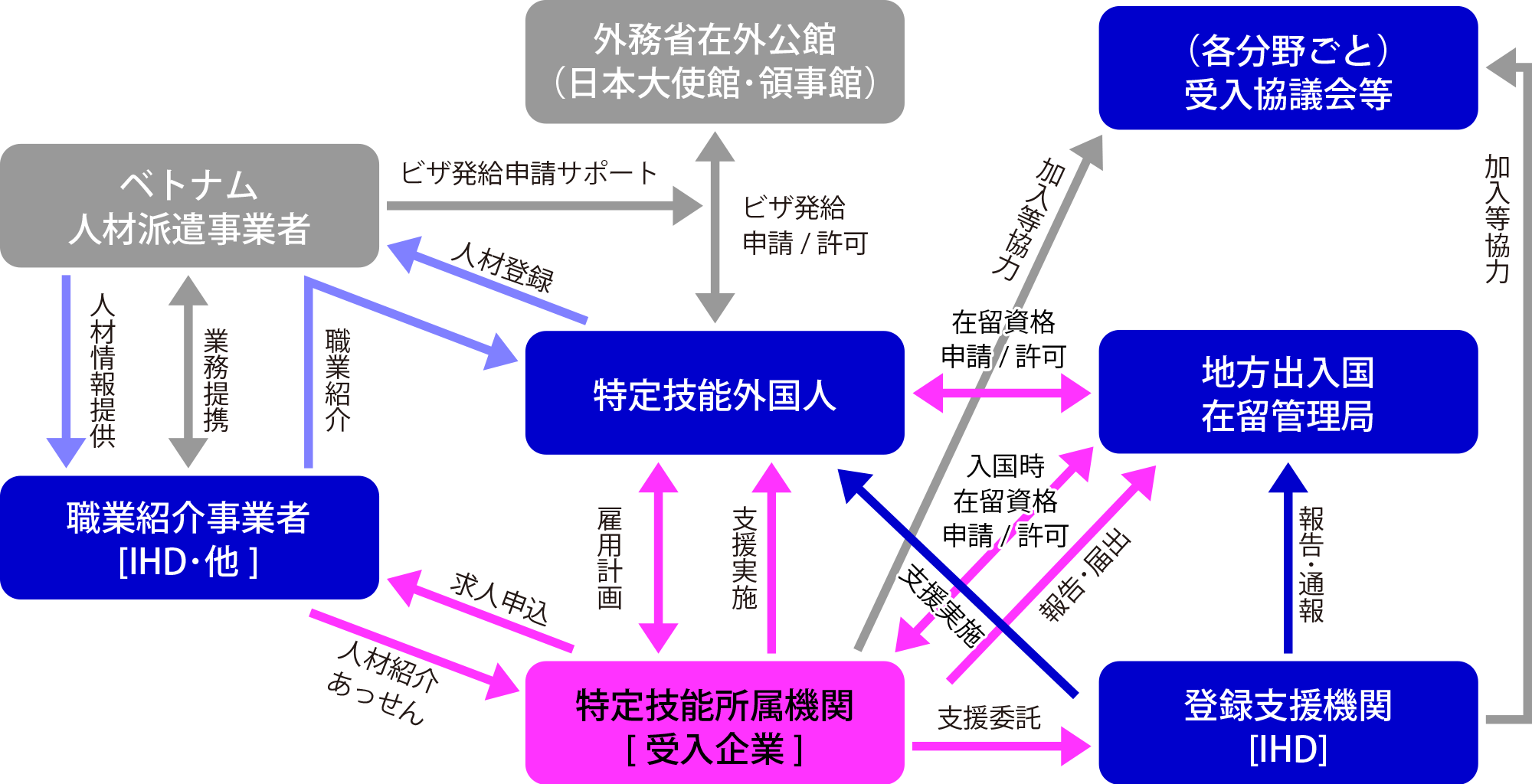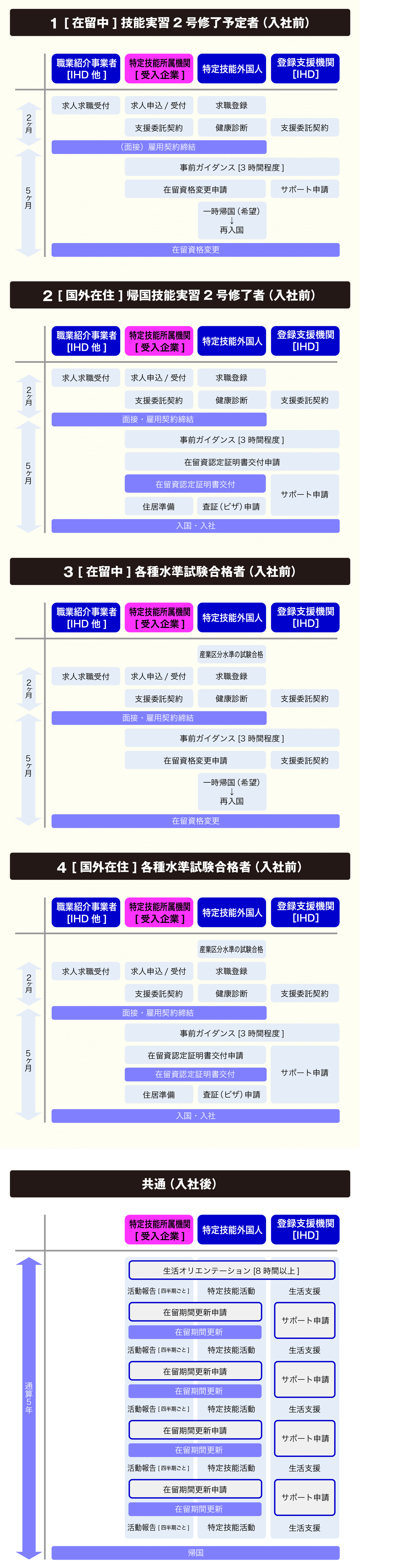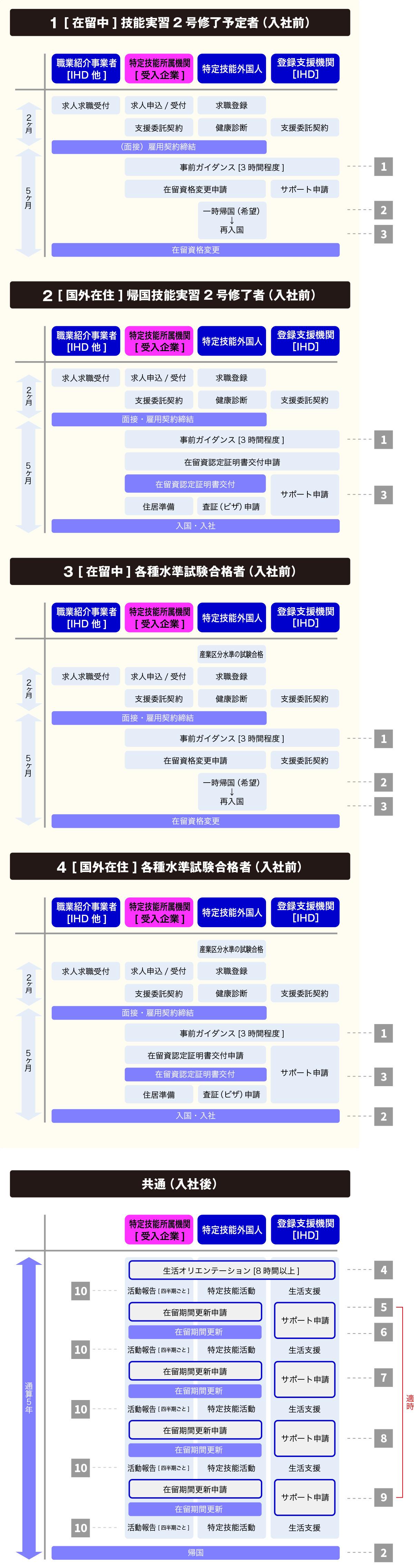 特定技能外国人が日本で働く上で、日常生活や社会生活での支援をどのように行うかの支援計画で、受入企業様(特定所属機関)、もしくはIHD(登録支援機関)が行います。